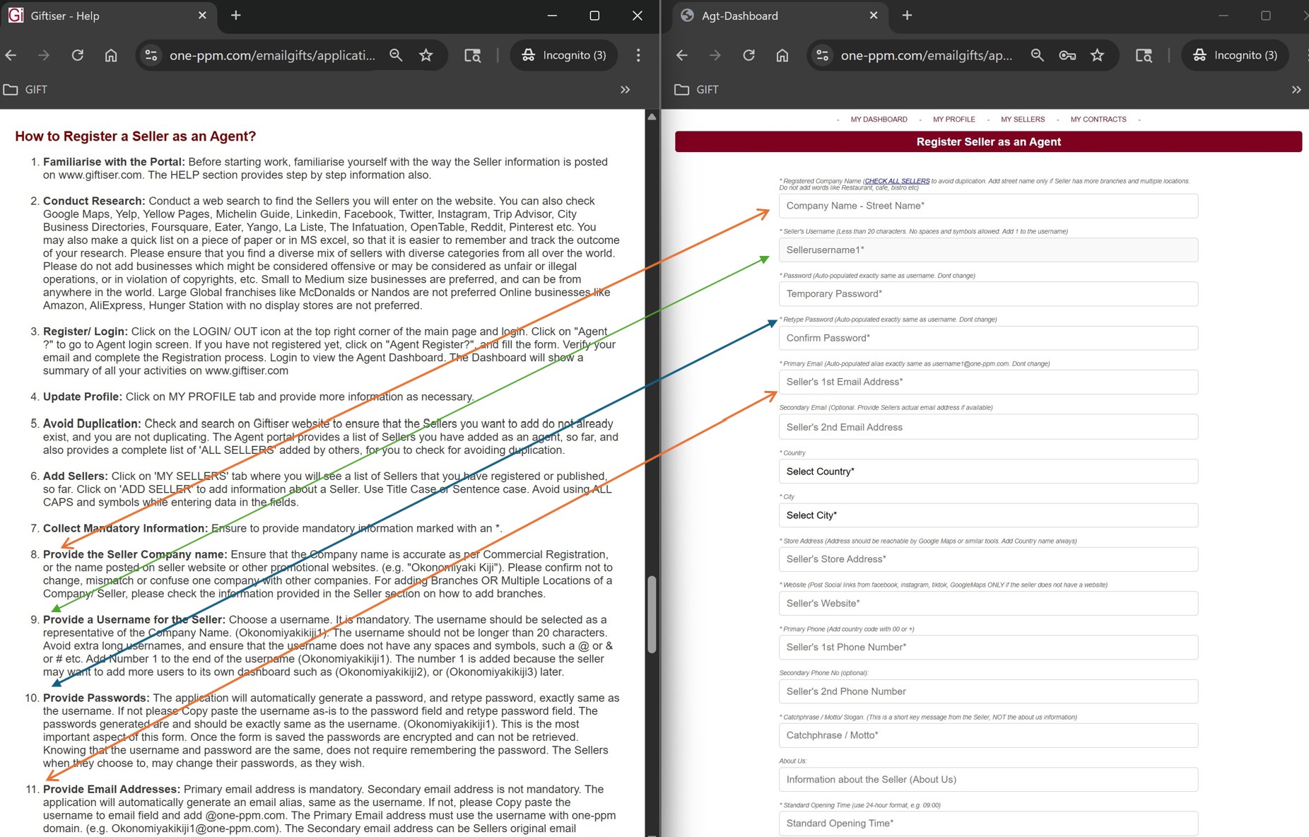 - Start Entering Seller Data: The most effective way to ensure that all requirements are met, and that you are doing justice to the Seller as an agent, is to open the 'ADD SELLER' form in a new window, and see/ have the HELP window and ADD SELLER window side by side. (Latest MS Windows versions allows SNAP Windows feature). Now while entering data you can read the related section in the HELP section to ensure accuracy and confromance. Click to see the screenshot.